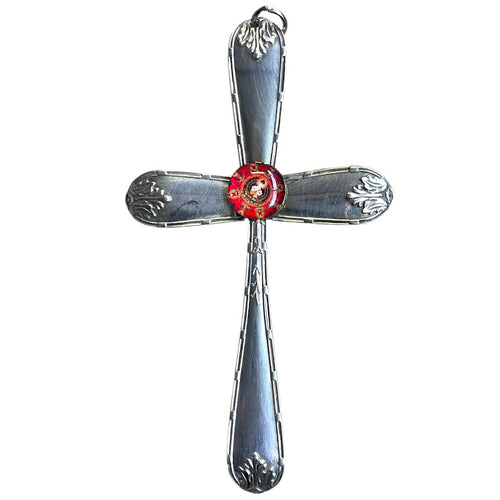 Beautiful crucifix cross hanging ornament made from upcycled silver plated cutlery