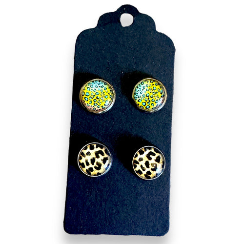 Upcycled two pairs of glass stud earrings with stainless steel posts - leopard print