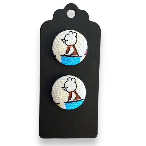 Upcycled fabric covered stud earrings with stainless steel posts - bear in boat