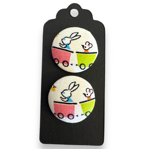 Upcycled fabric covered stud earrings with stainless steel posts - rabbit train