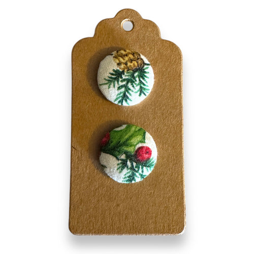 Upcycled fabric covered stud earrings with stainless steel posts - Christmas foliage