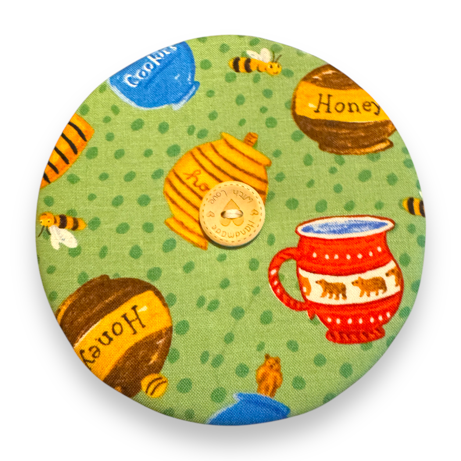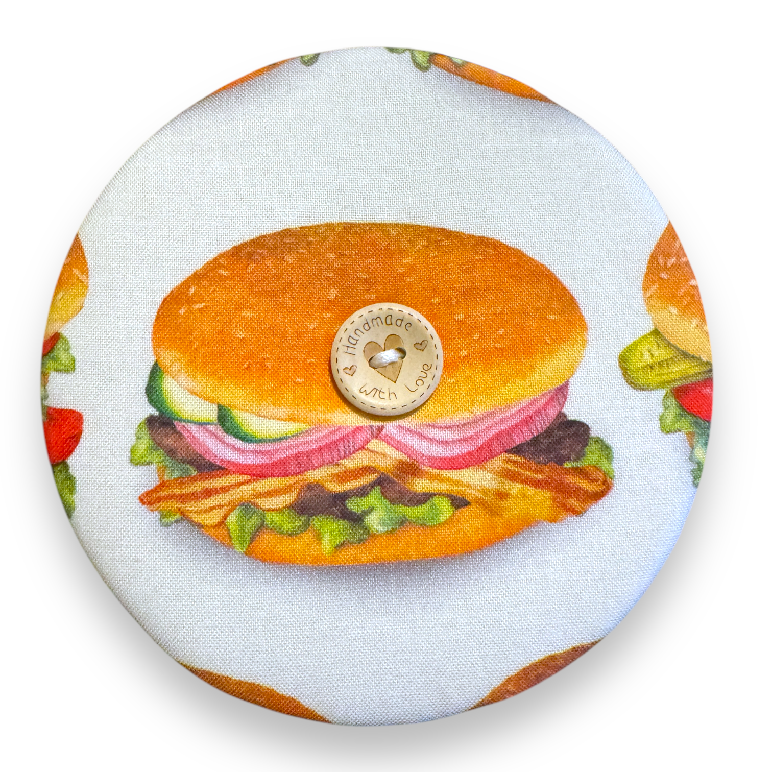 Upcycled double sided round padded playing card holder for kids or adults BURGER HONEY