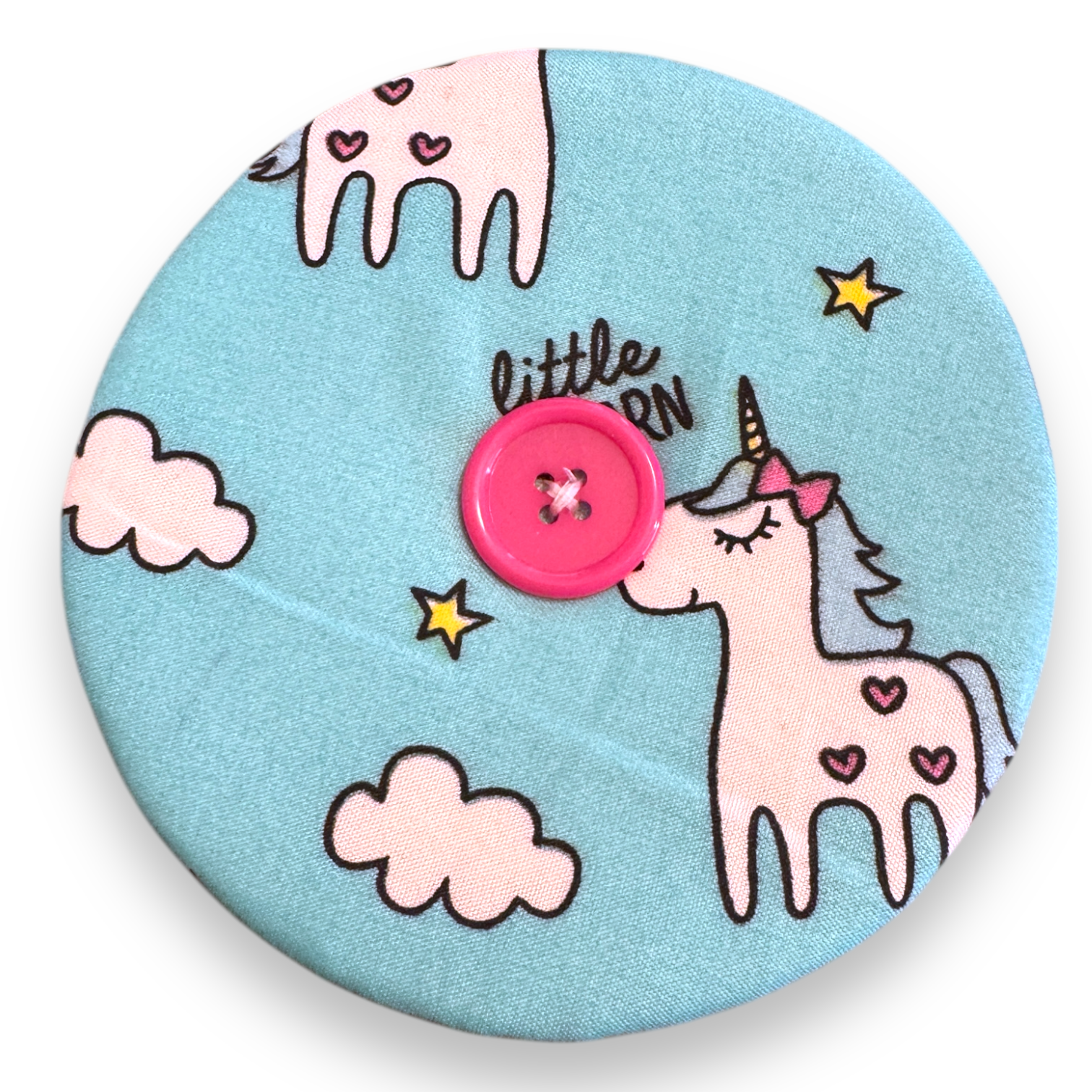 Upcycled double sided round padded playing card holder for kids or adults PANDAS & UNICORNS