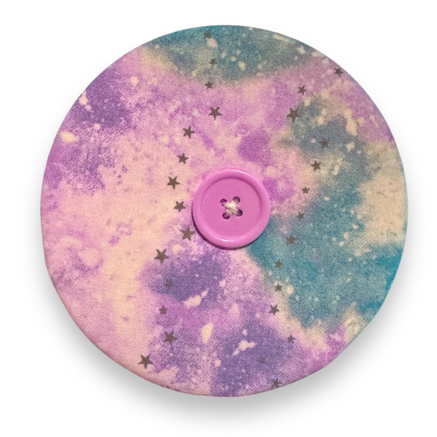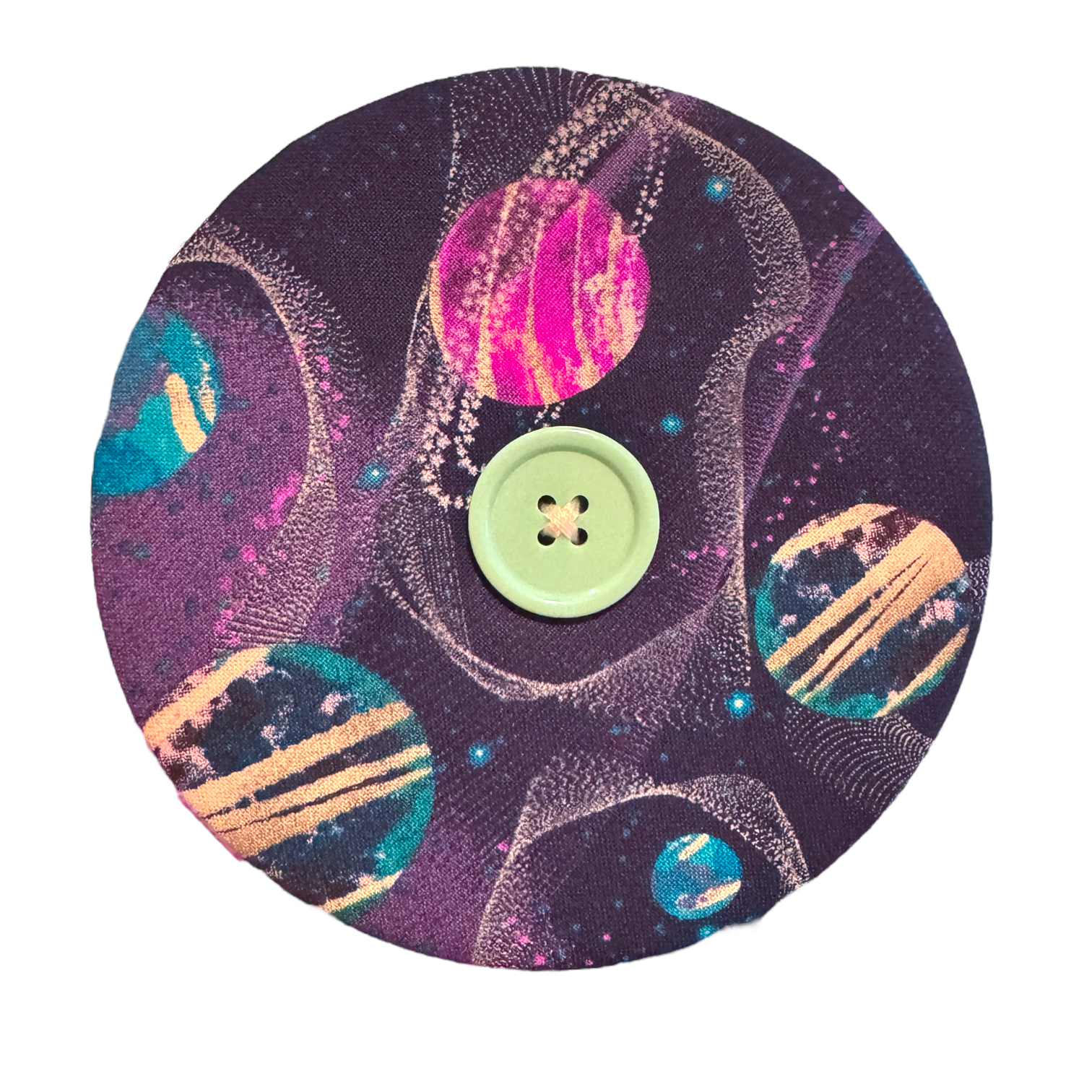 Upcycled double sided round padded playing card holder for kids or adults PURPLE PLANETS